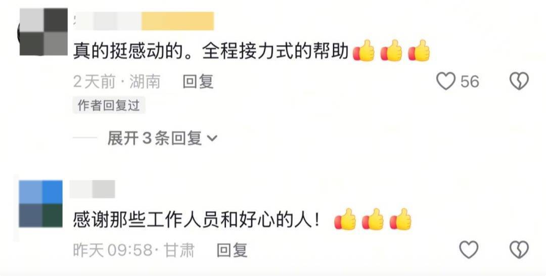 高铁上,前排乘客悄悄调直椅背,为她让出空间;邻座乘客帮她安置行李,又在她耳机不慎滑落时,迅速弯腰拾起递到她手中;出站时,工作人员自然牵起她的手,完成一场场“无缝接力”。这些她当时未曾察觉的细节,被网友一一捕捉并留言告知。