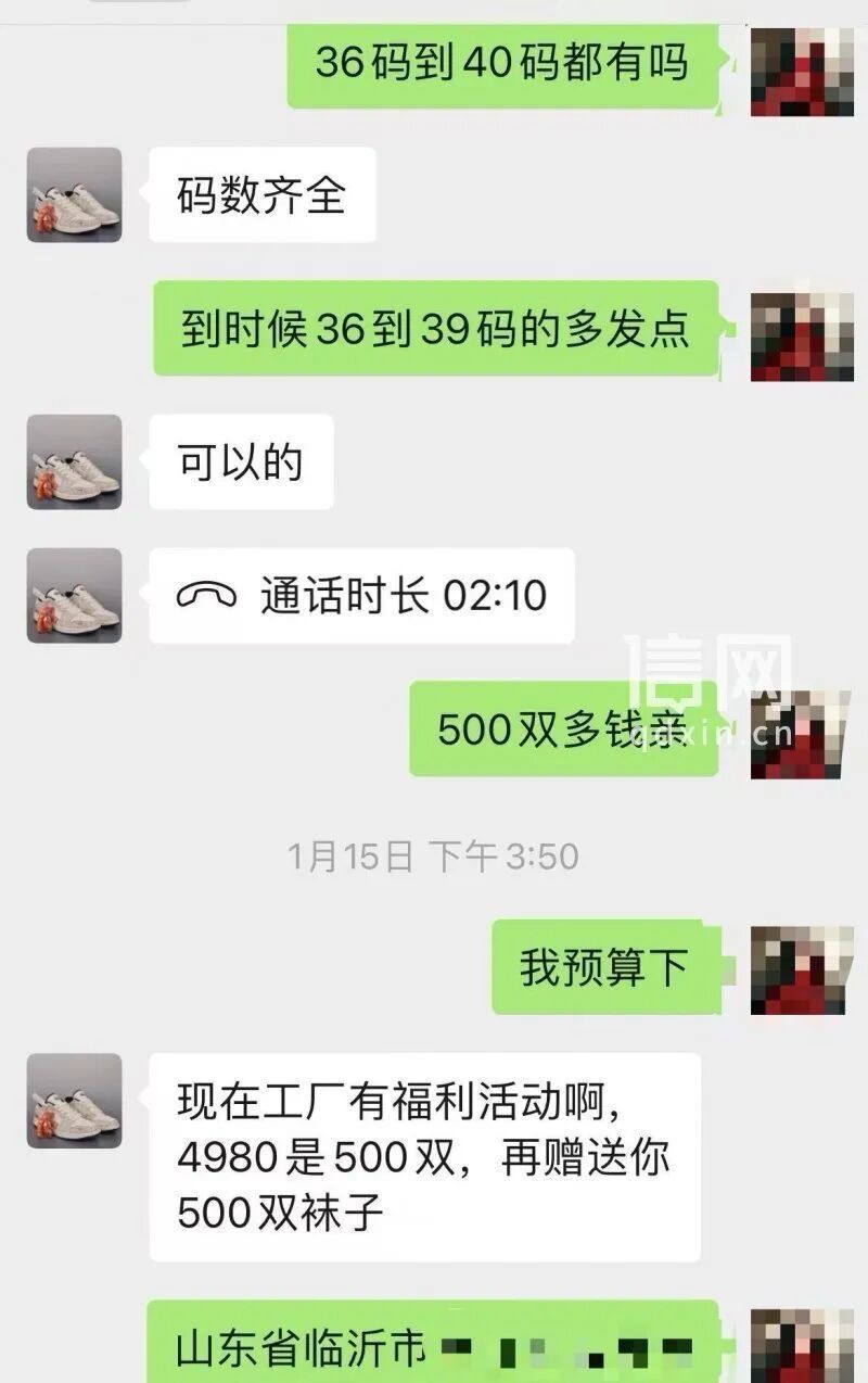 经过几轮沟通,双方约定以4980元的价格成交500双鞋,每双鞋价格不到10元,货品以36~40码的精品女鞋为主。况经理还表示,可以额外送500双袜子,相当于白赚。被“高利润”和“免费赠品”打动,刘女士在1月18日收到对方发来的物流单号后,便通过微信转账付清了4980元。